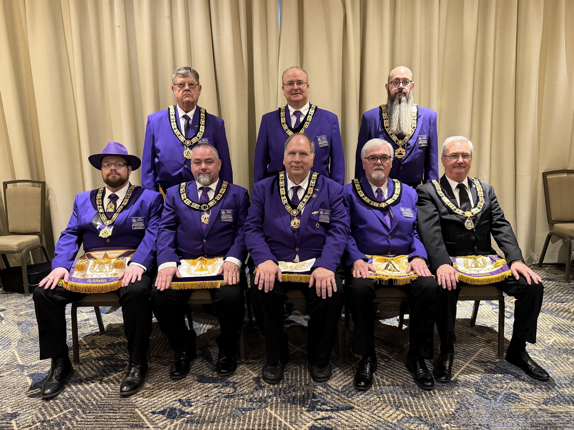 Seated Left to Right: Joel I. Bryant – Most Illustrious Grand Master, Brian K. Autrey – Right Illustrious Deputy Grand Master, Alan F. Rhody – Right Illustrious Grand Principal Conductor of the Work, Bobby K. Jordan – Right Illustrious Grand Treasurer, James C. McGee, PMIGM – Right Illustrious Grand Recorder